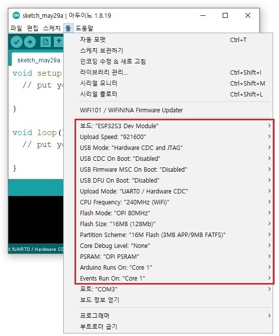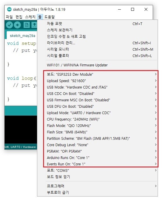 FLASH 는 OPI (8-Bit Mode) 32MB 이고 PSRAM은 OPI (8-Bit Mode) 8MB 이다