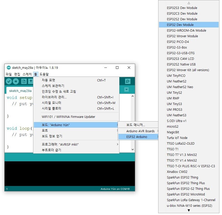 툴 -> 보드-> 보드 매니저 를 선택한다.
