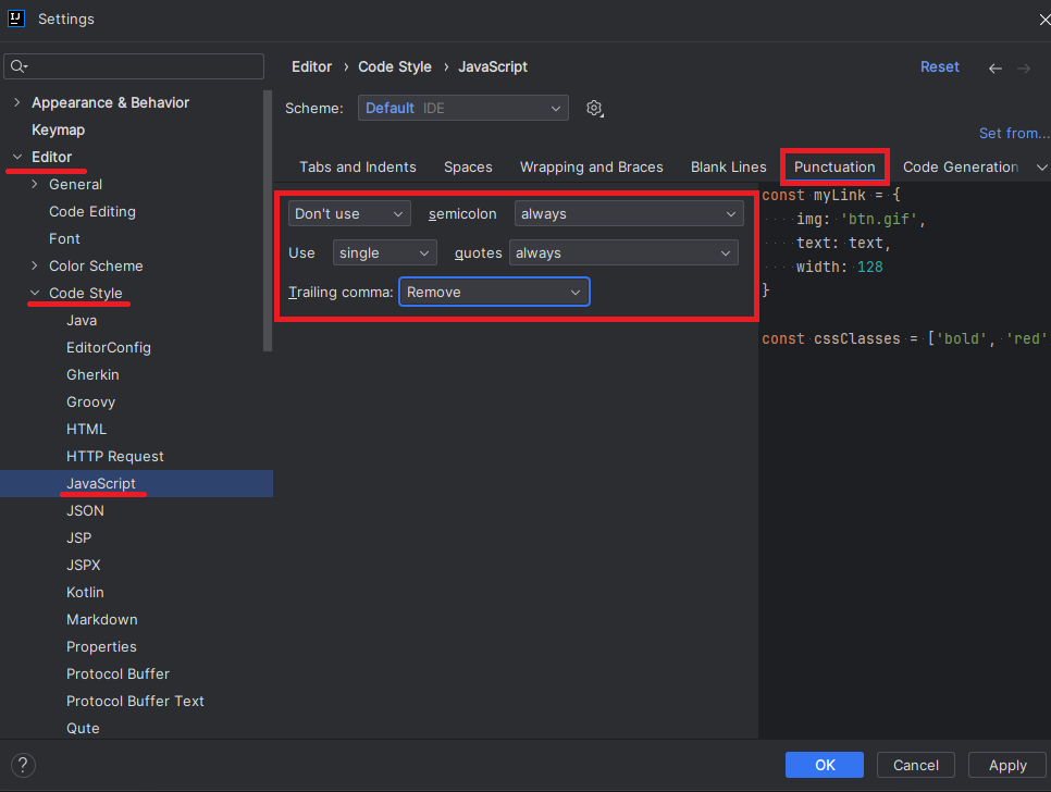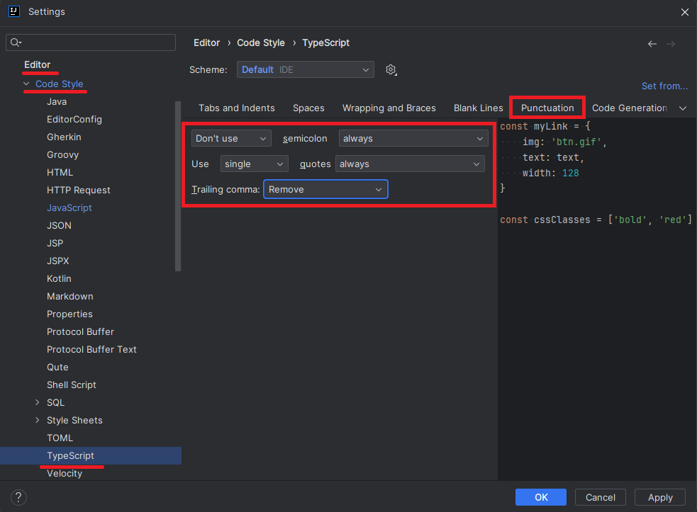 ② 설정 창의 메뉴에서 "Code Stlye"을 검색하거나 JS일 경우: [Editor - Code Stlye - JavaScript], TS일 경우: [ Editor - Code Stlye - TypeScript ]로 들어가서 "Pauctuation" 탭을 클릭하고