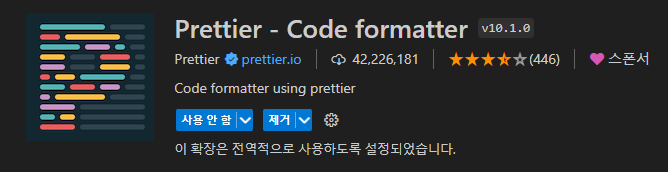 Prettier 확장팩이 설치 되어있다면 아래 화면 처럼 뜰 것이다.