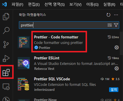 ① 왼쪽 상단의 메뉴들 중에서 확장 버튼을 누르고 "Prettier"를 검색해 아래와 같은 아이콘의 확장팩을 다운로드 한다.