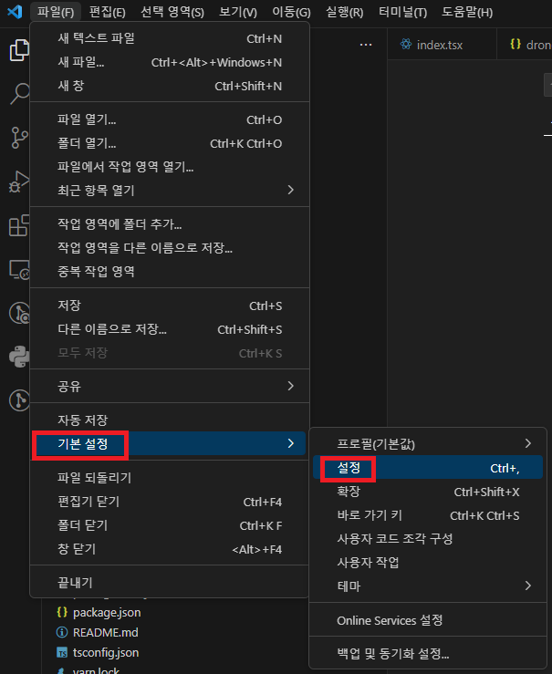 ② 설치를 했다면 [파일 - 기본 설정 - 설정] 을 눌러 설정창을 실행한다. 단축키: [Ctrl + "+"]