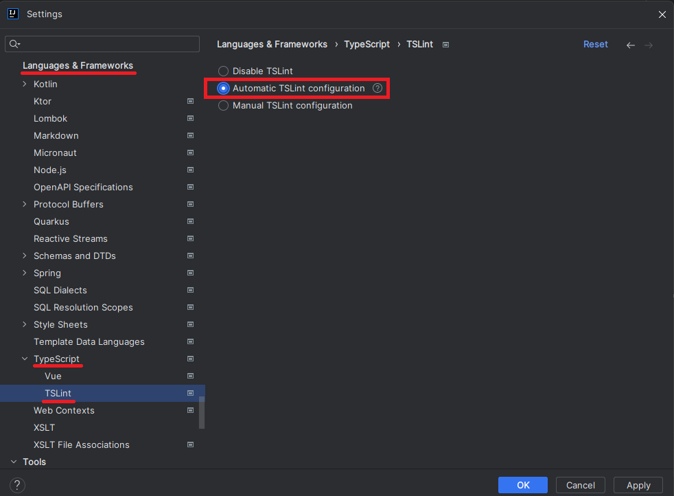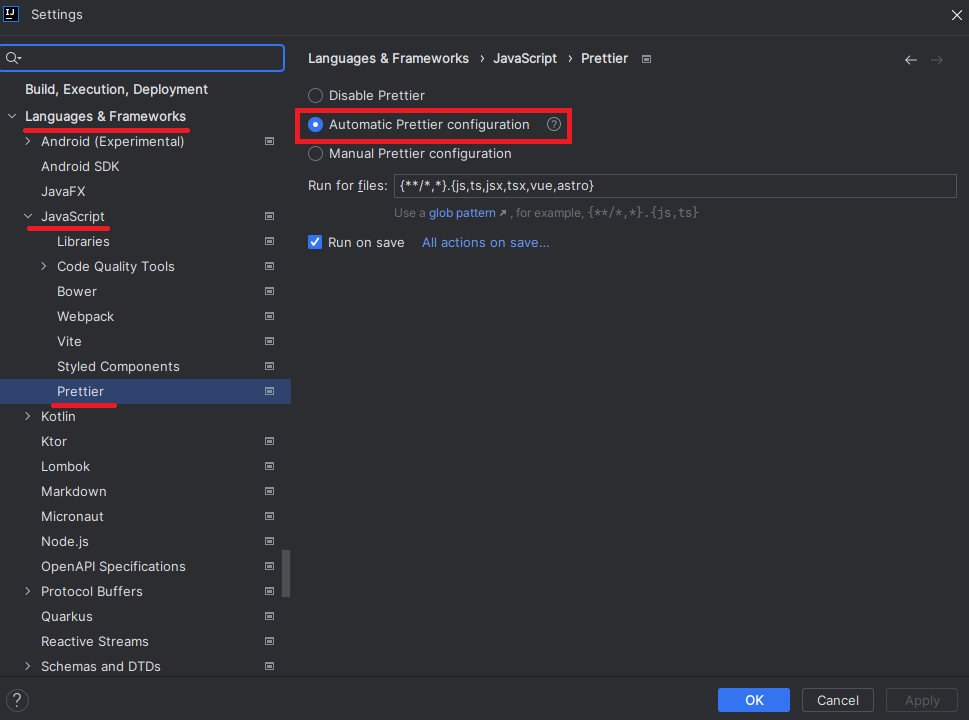 ③ 설정 창의 메뉴에서 JS일 경우: [ Languages & Frameworks - JavaScript - prettier ]에서 Automatic Prettier configuration에 체크 해주고, TS일 경우: [ Languages & Frameworks - TypeScript- prettier - TsLint ]에서 Automatic TsLint configuration에 체크하고 OK를 누른다.