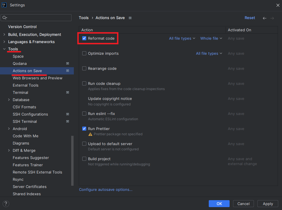 ⑤ 저장할때 Reformat code를 적용 하고 싶을 경우 [ Tools - Actions on Save ]로 들어가서 "Reformat code"를 체크해주면 저장할때마다 ;을 없애준다.