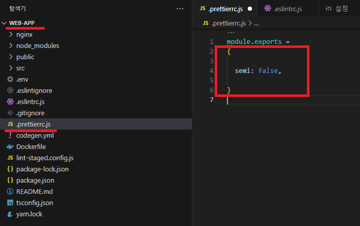 3 - 1) .prettierrc.js 파일에서 "semi": false로 설정해준다.