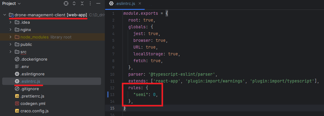 3 - 2) . eslintrc.js 파일에서 ruls에서 "semi": 0으로 설정해준다.