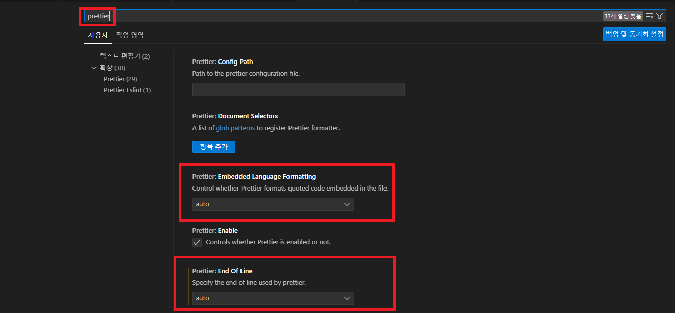 ③ 설정창의 검색에 "Prettier"를 검색해서 메뉴 중에 [Prettier:Embedded Language Formatting ] 과 [ Prettier:End Of Line ]을 auto로 설정 해준 후 오류를 확인 한다.
