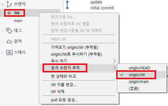JW 브랜치를 오른쪽 클릭한 후 [ 원격 브랜치 추적 → origin/JW ] 를 클릭하면 깃랩에서 생성한 JW 브랜치와 소스트리에서 생성했던 JW 브랜치가 연동이 된다.