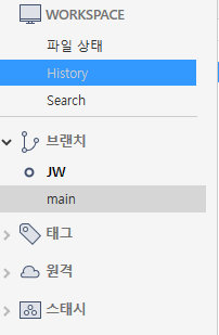소스트리에서 생성한 JW 브랜치가 선택되어 있는 것을 볼 수 있다. 하지만 깃랩에서 생성한 브랜치와 연동이 필요하다.