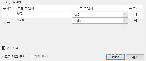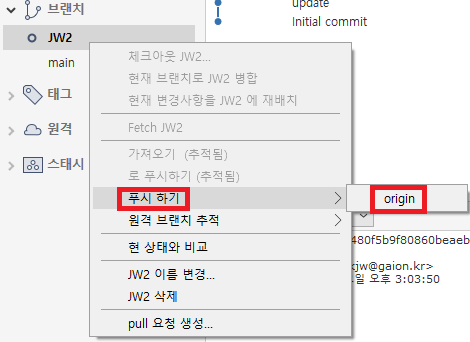 깃랩과 연동이 필요한데, JW 브랜치를 오른쪽 클릭한 후 [푸시하기 → origin] 를 클릭한 후 푸시할 브랜치를 방금 생성한 브랜치로 선택 후 Push 버튼을 누르면 깃랩에 변경 내용이 업로드 된다.