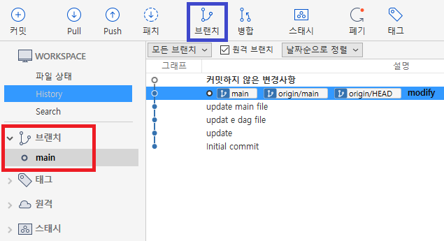 클론된 소스트리를 보면 main 브랜치(빨간색) 밖에 없는걸 볼 수 있다.