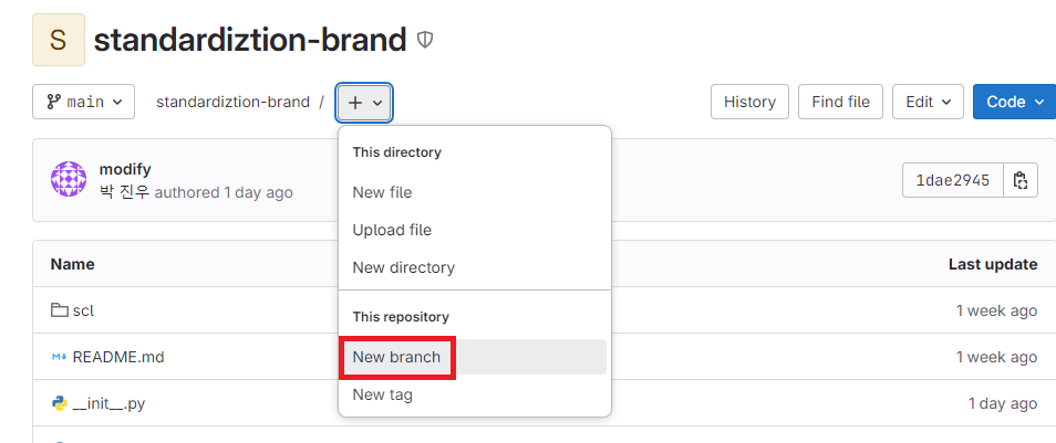 이름은 임의로 생성 가능 하지만 깃랩에서 생성한 브랜치명과 동일하게 생성하도록 한다.