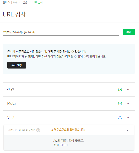 ※ 적용을 한후에도 계속 SEO에 똑같은 오류가 나타난다며 수집요청을 누른뒤