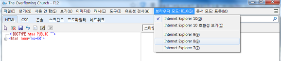 : IE에서 테스트할 때 중요한 것은 IE는 버전별로도 다르게 보이기 때문에 항상 버전별로도 테스트를 하면 좋다는 것이다. IE9 이후에서 메뉴의 도구>개발자툴(또는 F12 단축키)에서 이번에는 브라우져 모드를 IE8로 설정해서 테스트 해보자.