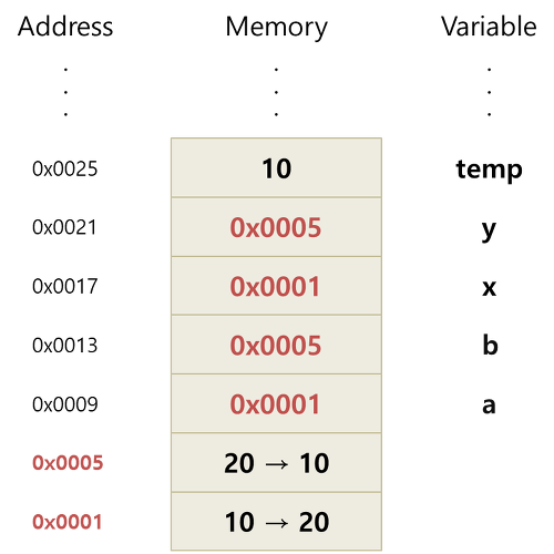 main()에서 선언 된 CallByReference 타입의 변수 a와 b는 각각 객체를 생성하여 0x0001번지와 0x0005번지에 저장된 10과 20의 주소 값을 저장하게 됩니다. 이후, swap() 메서드 호출 시에 인자 a와 b는 메모리에 저장 된 주소 값을 복사하여 매개변수 x와 y의 메모리에 저장한다. 결국 swap() 메서드는 10과 20이 저장 된 0x0001번지와 0x0005번지의 주소를 참조하여 연산하기 때문에, 연산 결과에 따라 원본 데이터가 변하게 된다. main()에서 선언 된 변수 a와 b는 각각 0x0001번지와 0x0005번지를 가리키고 있기 때문에 변한 데이터를 불러들여 결과 값이 변하게 된다.
