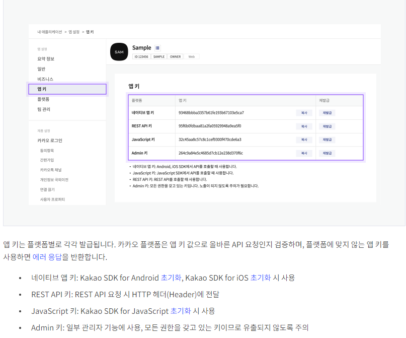 앱을 생성하면 플랫폼별 앱 키(App Key)가 발급됩니다. 발급받은 앱 키는 [내 애플리케이션] > [요약 정보] 또는 [내 애플리케이션] > [앱 키]에서 확인할 수 있다. 각 앱 키의 [복사] 버튼으로 값을 그대로 복사해 사용하면 편리한다.