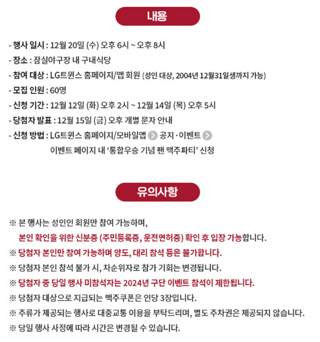 LG트윈스 팬 맥주파티 정보 및 신청(12월 20일 수요일 6시)