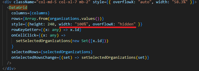 뭐 여러가지 방법이 있겠지만 저 에러의 근본적인 문제를 파악하기 위해 ResizeObserver가 비정상적으로 작동할 때 발생지를 먼저 찾았다. 주석 처리를 하면서 해당 컴포넌트를 찾으니 DataGrid 컴포넌트에서 발생한것을 알아냈고 해당 컬럼열들의 넓이가 DataGrid보다 넓이가 커서 발생한 것을 알아냈다.