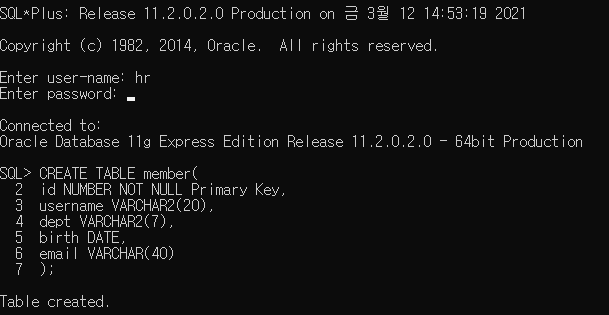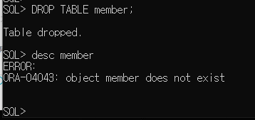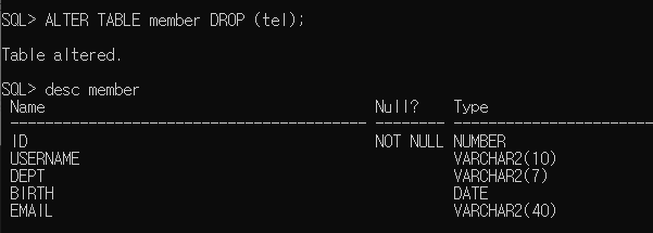 - ALTER TABLE member add (tel varchar2(30) NOT NULL);
