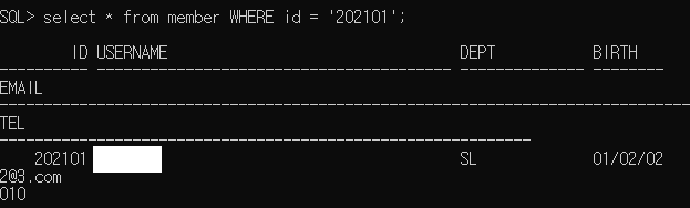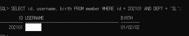 - SELECT id, username, birth FROM member WHERE id = 202101 AND DEPT = 'SL';
