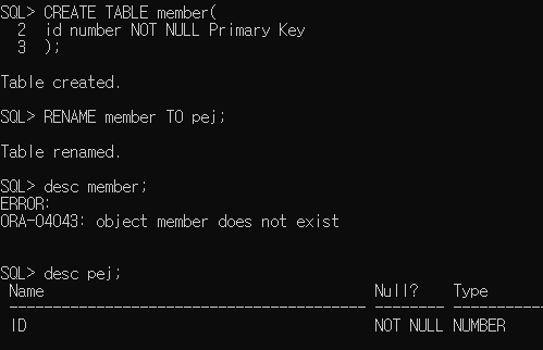 SQL > RENAME 테이블명 TO 바꿀테이블명;
