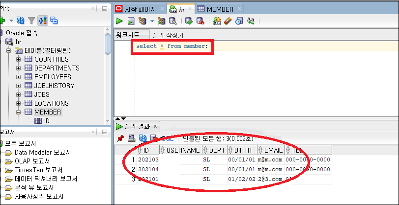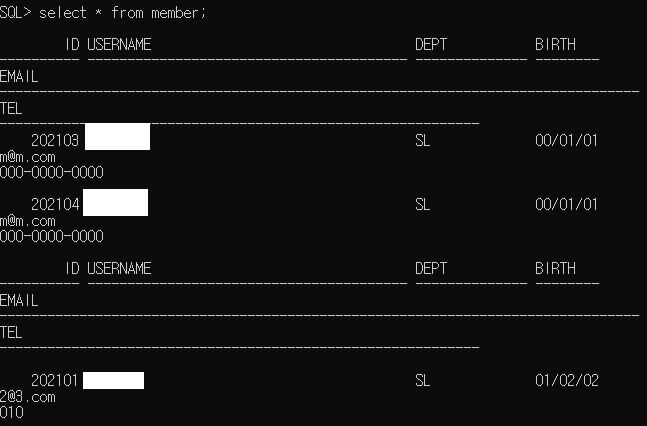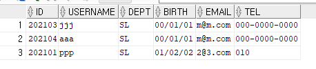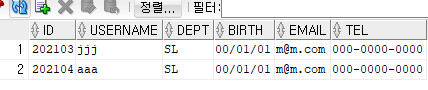 INSERT INTO member VALUES(202103,'홍길동','SL','00.01.01','m@m.com','000-0000-0000'); INSERT INTO member VALUES(202104,'장길산','SL','00.01.01','m@m.com','000-0000-0000'); INSERT INTO member(id,dept,username,birth,email,tel) VALUES(202101,'SL','너무해','01.02.02','2@3.com','010');