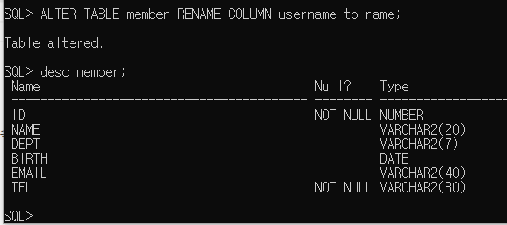 - ALTER TABLE member RENAME COLUMN username to name;