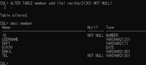 - ALTER TABLE member add (tel varchar2(30) NOT NULL);
