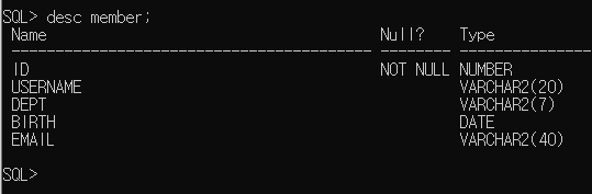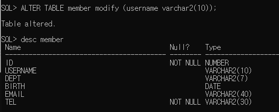 - ALTER TABLE member modify (username varchar2(10));
