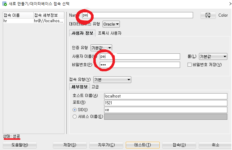 - 테스트를 누른다. (좌측 하단 상태 라벨에 "성공" 이 뜨면 완료)