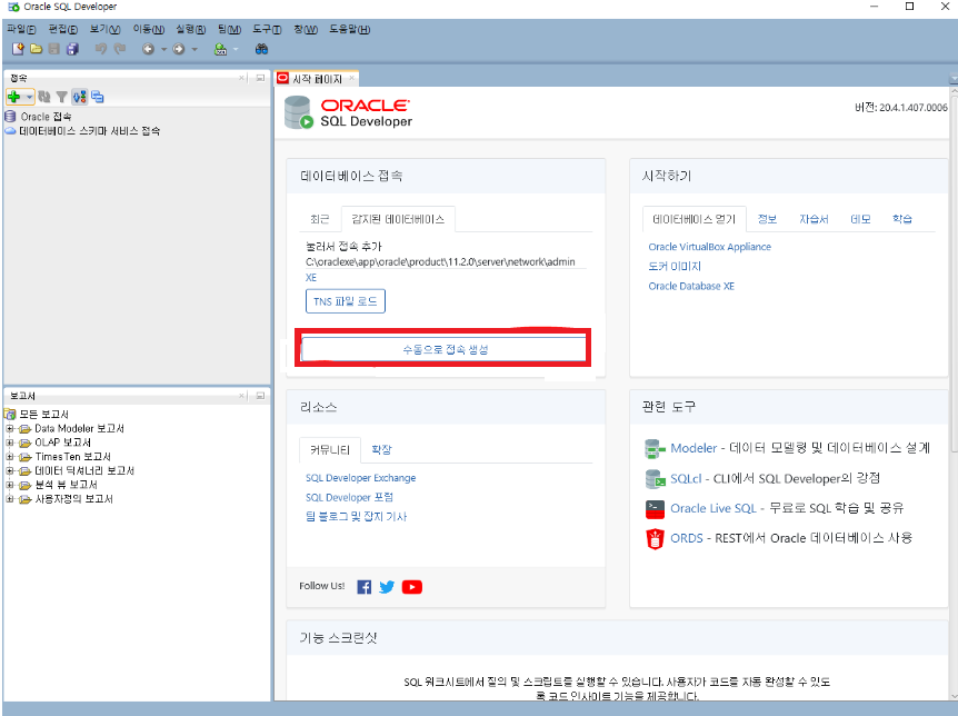 - 저번에 설치한 SQL Developer를 실행시키고 " 수동으로 접속 생성 "을 클릭한다.