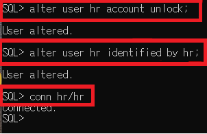 * conn (connection의 약자) hr/hr // 잠금해제와 비밀번호가 정상적으로 바뀌었고 접속이 되는지 확인