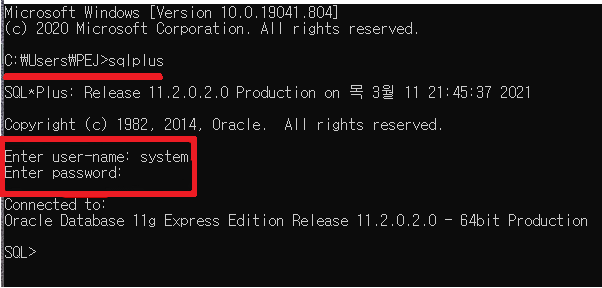 - CMD창을 키고 sqlplus를 입력.