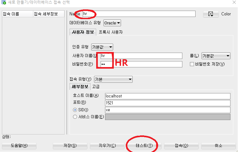 - 위에서 잠금해제한 hr 계정으로 접속연결.