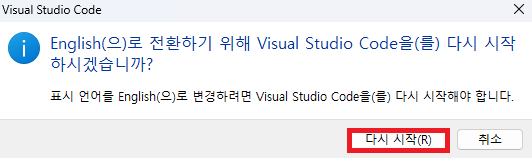 2. English를 클릭하면 VScode의 언어를 한국어라고 물어보고