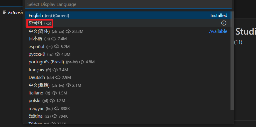 VSCode 메뉴 언어 설정 변경(한국어, 영어)