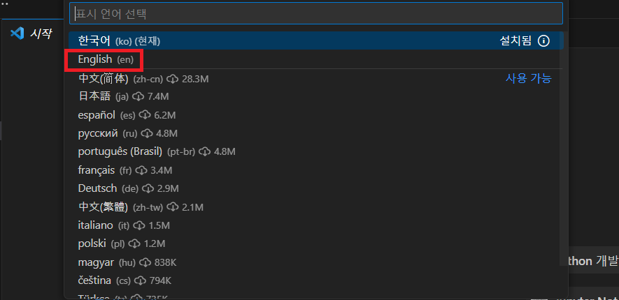2. English를 클릭하면 VScode의 언어를 한국어라고 물어보고