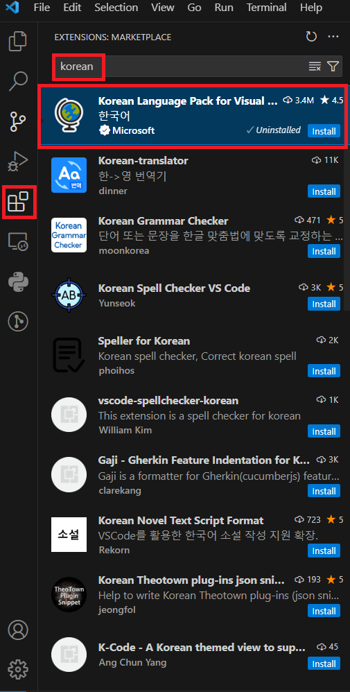 왼쪽메뉴의 확장팩버튼(빨간색 네모)을 클릭하고 검색창에 "Korean"을 입력해서