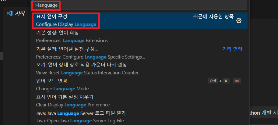1. [Ctrl + Shift + P]키를 누르고 "language"를 입력하고