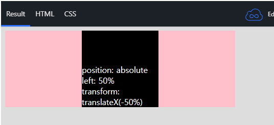 <span class="absolute">position: absolute<br>left: 50%<br>transform: translateX(-50%)<br></span>