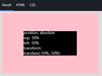 <span class="absolute">position: absolute<br>top: 50%<br>left: 50%<br>transform: translate(-50%,-50%)</span>