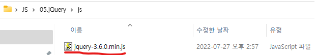 jquery-3.6.0.min 파일을 다운로드 한뒤, 자신의 프로젝트 dir에 이동시킨다.
