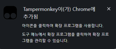 3. 잠시후 설치가 잘됐다 되면 Tampermonkey was successfully installed!라고 뜬다.