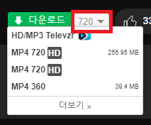 6. 다운로드 버튼의 오른쪽 숫자 부분을 클릭하면 화질을 선택할수 있고, 초록색 다운로드 버튼을 [ Alt ]키와 함께 클릭하면 다운로드가 시작되고 다운로드 폴더에 "videoplayback" mp4 파일로 저장된다.