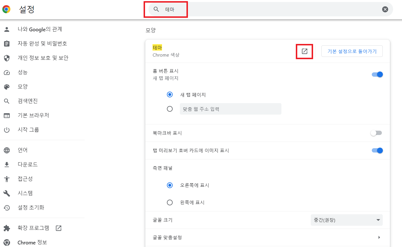 또는 크롬 설정 → 검색창에 "테마" 입력후 오른쪽에 아이콘 클릭)